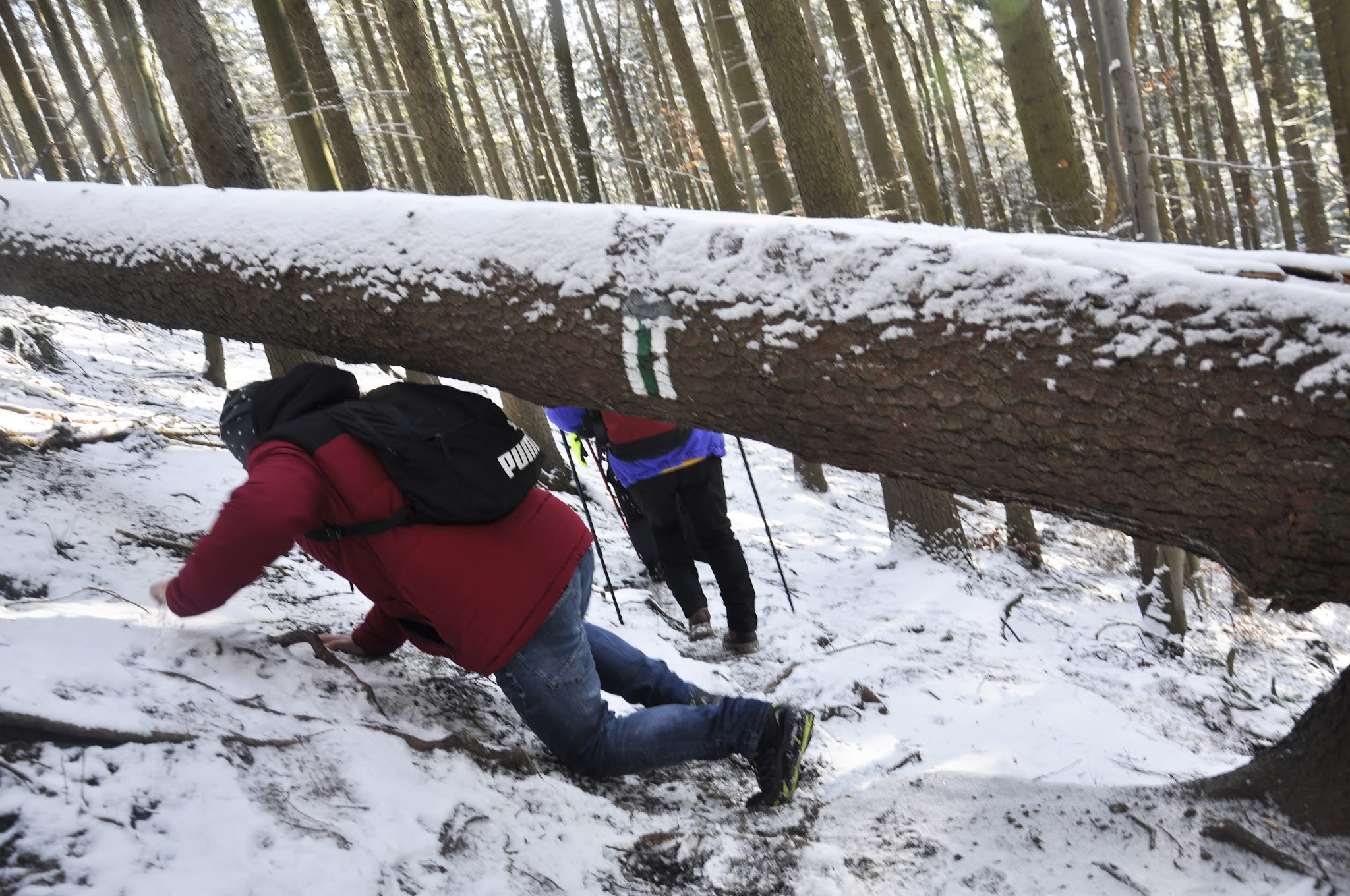 Tourist Bus, z którym jeżdżą na wycieczki. Przemek wypatrzył, że jest w planach wyprawa na Trójgarb i Chełmiec i postanowiliśmy się zapisać. Dzień wcześniej na Śląsku przez cały dzień pasał deszcz i deszcz ze śniegiem (z akcentem na deszcz) i sobotni wyjazd widziałam trochę w czarnych barwach. Pobudka o godzinie 2:30 też nie napawała optymizmem (zwłaszcza przy wieczornym powrocie do domu). Ale... BYŁO WARTO! W Lubominie mieliśmy jeszcze okazję podziwiać kolorki wschodzącego słońca. Trasa na Trójgarb była dość łagodna i obfitowała w piękne widoki. Mieliśmy dużo szczęścia, bo śnieg nie padał (zdążył to zrobić w nocy), było go mało, czyli szło się całkiem dobrze, a widoki było totalnie zimowe. Na Trójgarbie weszliśmy na wieżę widokową, a potem zrobiliśmy sobie przerwę na posiłek, bo trzeba było zregenerować siły przed dalszą drogą. Podczas zejścia z góry mieliśmy atrakcję w postaci kilu połamanych drzew, ale te przeszkody dało się szybko pokonać. Prawdziwy hardcore zaserwował nam Chełmiec. Strome podejście w górę do łatwych nie należało, a świeży śnieg sprawy nam nie ułatwiał (musimy w końcu kupić sobie raczki). Za to po pokonaniu tego odcinka czuliśmy się jak prawdziwi zdobywcy! Wieża widokowa na Chełmcu była zamknięta (jest otwarta tylko w sezonie). Tutaj zrobiliśmy sobie drugą przerwę na posiłek. I jeśli myśleliśmy, że najtrudniejszy odcinek mamy za sobą, to baaardzo się myliliśmy. Zejście stromym szlakiem było dla ekipy pełne upadków, poślizgów i łapania się w biegu gałęzi. Na szczęście nic się nikomu nie stało, a fajne wspomnienia pozostaną na zawsze. Kiedy zbliżaliśmy się do busa, akurat zachodziło słońce. Czyli w sumie byliśmy na powietrzu od wschodu do zachodu. W drodze powrotnej pojechaliśmy jeszcze na przepyszny obiad. Humory dopisywały wszystkim przez całą wycieczkę. Dzisiaj czuję wszystkie mięśnie w nogach (nawet te, o których istnieniu nie miałam pojęcia), za oknem cały dzień pada deszcz, a nas nie opuszcza dobry humor i cały czas wspominamy wycieczkę. Jak wspominałam na początku, była to nasza pierwsza wycieczka z Tourist Bus. Ale... na pewno nie ostatnia! Dzięki wszystkim za super wyjazd! :)